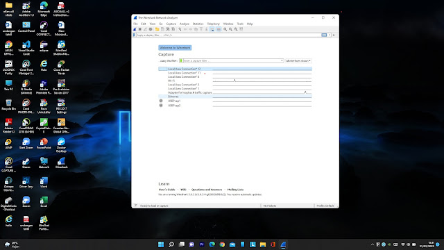 16. setelah restart silakan buka aplikasi wireshark kembali . tampilan pertama akan muncul seperti ini dan siap di gunakan . jika ingin melakukan pengawasan lalulintas jaringan silakan klik dua kali pada list nama jaringan tersedia .